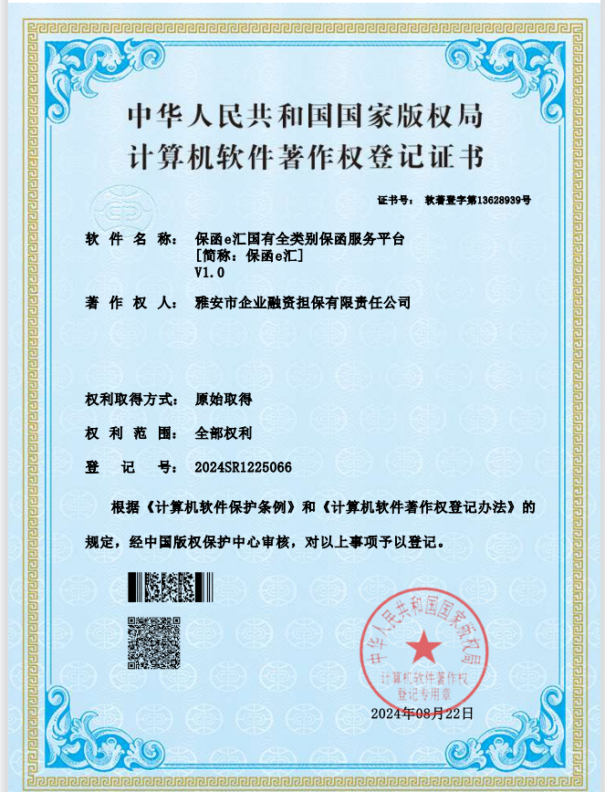 近日,由雅安市擔(dān)保公司開(kāi)發(fā)完成的《保函e匯國(guó)有全類別保函服務(wù)平臺(tái)(簡(jiǎn)稱:保函e匯)V1.0》軟件通過(guò)國(guó)家版權(quán)局的最終審查,獲得由中華人民共和國(guó)版權(quán)局頒發(fā)的計(jì)算機(jī)軟件著作權(quán)登記證書(shū)。